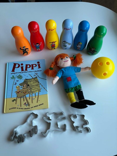 Pippi Långstrump paket med bowling, bok, docka och kakformar. Bowling-setet består av sex käglor i olika färger och ett gult klot. Käglorna har motiv av Pippi Långstrump och hennes vänner. Boken "Pippi Långstrump på Kurrekurreduttön" är en bilderbok av Astrid Lindgren och Ingrid Nyman. Dockan föreställer Pippi Långstrump. Kakformarna är i metall och föreställer Lilla Gubben, Herr Nilsson och Pippi Långstrump.