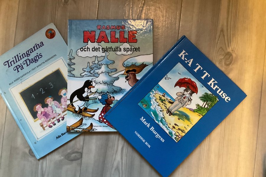 Bokpaket med tre barnböcker: ”Trillingarna På Dagis” av Roser Capdevila och Birgitta Rosenberg, ”Rasmus Nalle och det gåtfulla spåret” av Carla & Vilh. Hansen, BASERAD på Carla och Vilhelm Hansens berättelser.