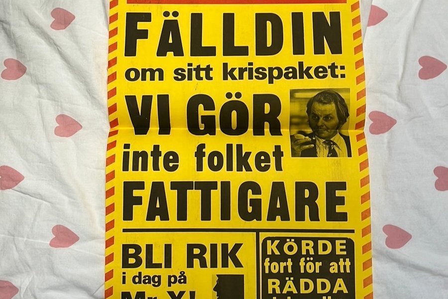 En Kvällsposten löpsedel från den 29 augusti 1977. Tidningen har rubriker som ”Fälldin om sitt krispaket: Vi gör inte folket fattigare”, ”Bli rik i dag på Mr X! Värd 7500” och ”Körde fort för att rädda sjuk pojke - åtalas?”.