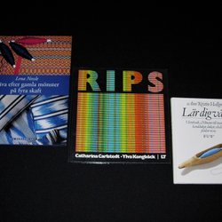 Modets historia, Stickat i ekologisk ull och Stick- och broderikonst. Samtliga är i bra skick, men det högblanka svarta omslaget till Stick- och broderikonst är mattflammigt på baksidan. Utan omslag är bok och inlaga i bra skick.