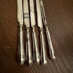 Fruktknivar med skaft i pärlemor. Rostfritt stål. Märke: Harrison Brothers & Howson. Etui.
