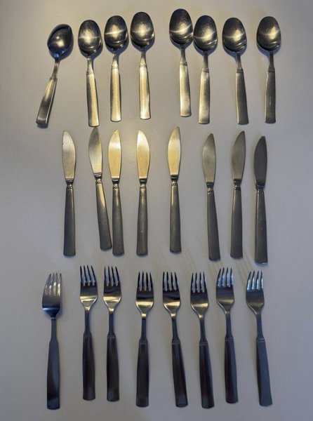 Bestick set med skedar, knivar och gafflar. 8 av vardera - en kniv är dock lite tjockare och en är lite skadad i toppen. Bra skick för övrigt De är 18,5 cm o kniven 19,5 cm.