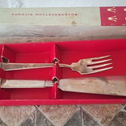 Bestickset från GULDSMEDERNAS AB. Setet innehåller en sked, en kniv och en gaffel. Totalvikt 148 gram.