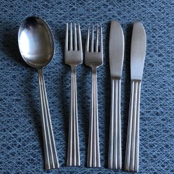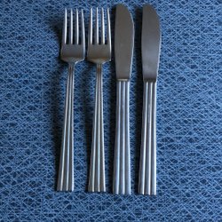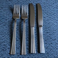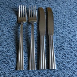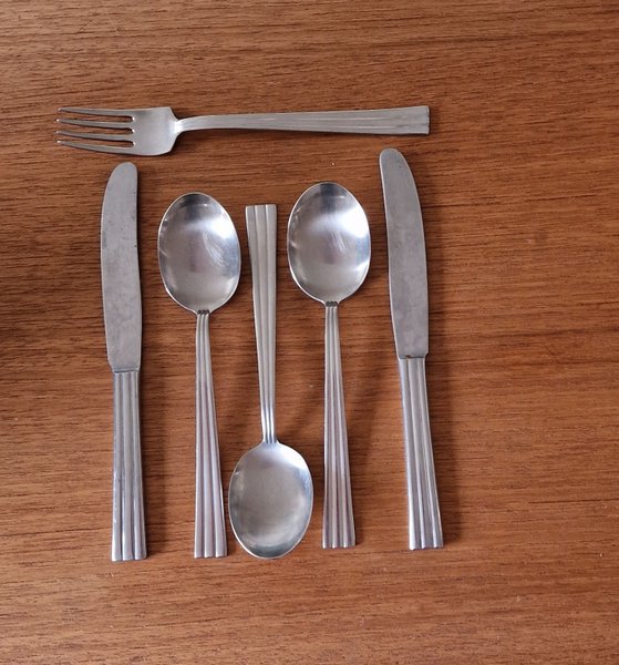 Tre matskedar, två knivar och en gaffel i serien Thebe i rostfritt stål från Gense.