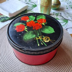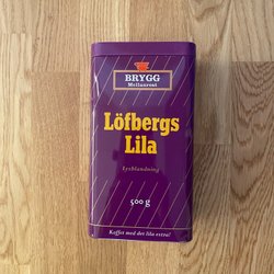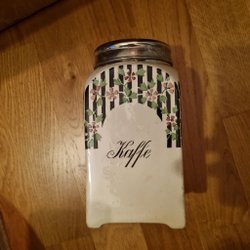 En kaffe burk i plåt. Lite skev när man öppnar locket men funkar bra ändå när man stänger locket. Liten spricka uppe vid kanten, ca 10 mm, se bild. Fin inrednings burk.