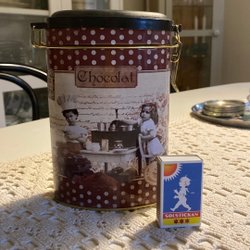 En burk med lock. Burken är vit med ett mönster i beige och vitt nedtill. Locket är beige.