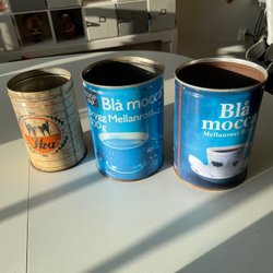 Kaffeburk i vitt med ett dekorativt lock föreställande en kaffesäck med kaffebönor och en skopa.