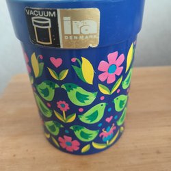 Orange burk från ira Denmark. Mått höjd ca 14 cm, diameter ca 12 cm. Retro, 70-tal. Tecken på användning finns. Bra begagnat skick.