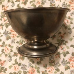 En vacker såsskål med tre fötter och ett handtag.