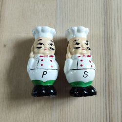 Ett par salt- och pepparströare i metall. Den ena ströaren är guldfärgad med texten "Percival Duffin's SALT" och den andra är grön med texten "Elton Kirby's PEPPER".