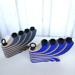 Ljusstake i trä med plats för tre ljus. Basen är rektangulär och ljusstakarna är fästa i en solfjäderformad design. Undersidan av basen har texten "Nº100 2kr" instansad.