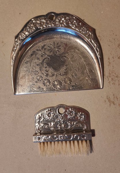 En bordsborste med skyffel från början av 1900-talet, användes för att borsta smulor från bordet. Skyffeln är 12x14 cm. Pläter och svinborst.