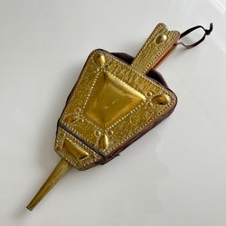 Denna vintage blåsbälg i mässing och läder är ett klassiskt verktyg som används för att effektivt få igång en öppen spis eller eldstad genom att blåsa en riktad ström av luft.