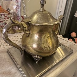 Säljer en vacker och karaktäristisk miniatyrvas (eller liten kanna) med ett dekorativt motiv av en stiliserad figur i relief. Föremålet har en mjuk, organisk form och en fin lyster.
