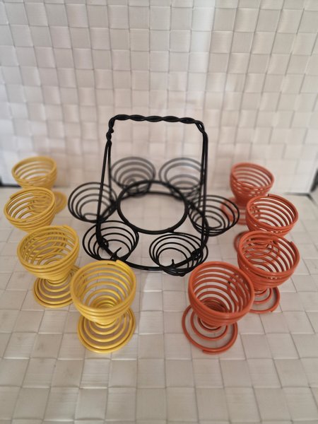 Svart äggställ med handtag. Inkluderar 14 äggkoppar i färgerna gul och orange. Svarta- h-13 cm, d- 18,5.
