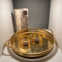 En guldfärgad bricka med handtag. Brickan har ett mönster på ytan och en perforerad kant.
