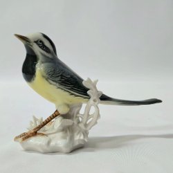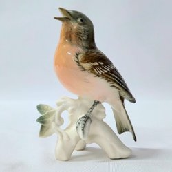 En vacker porslinsfigur föreställande en fågel som sitter på en gren med löv och bär.