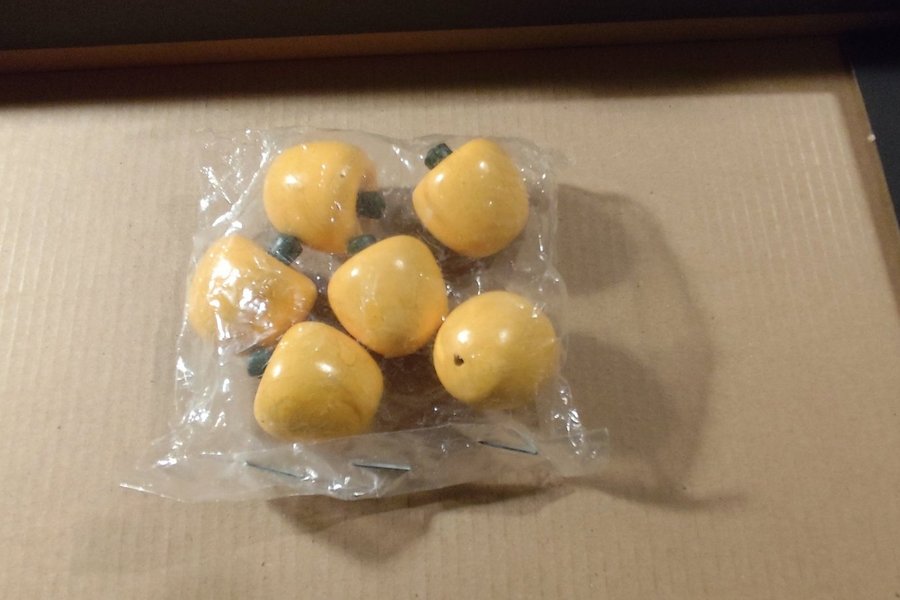6 st mörkare gult trä äpplen. Dekorationer passar till ljustake mellanstor Toarpskrona.