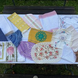 Ett set med fyra broderade dukar. En löpare med ljusmotiv och tre mindre dukar med blommor och fåglar.