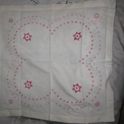 Duk som är handbroderad på linneliknande väv. Färgerna påminner om hallandssöm. Duken är 110x110 cm. Fållad och klar med spets runtom. Nygjord.