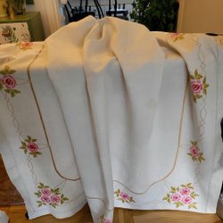 Vacker stor duk i vitt linnetyg med ett centralt broderat mönster av blommor i klara färger. Runt det centrala mönstret finns mindre broderade blommor utspridda över duken. Duken har en virkad kant runt om. 135x135 cm.