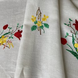 Duken är handbroderad med ett mönster i rosa och grönt. Mycket fint arbete och duken är i mycket gott skick. Inga fläckar eller skador.