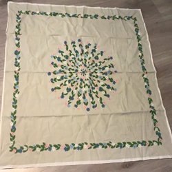 En vacker vintage duk i linne med ett intressant mönster. Perfekt för att duka bordet till speciella tillfällen eller för att ge en touch av vintage till din inredning.
