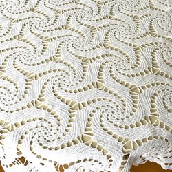 Vacker ljusblå duk från 1970-talet med vävt mönster i vitt. Duken har legat oanvänd i ett skåp många år så vecken framgår tydligt. Behöver nog blötas för att stryka ut vecken men det överlåter jag till ny ägare. Inga skador eller fläckar.