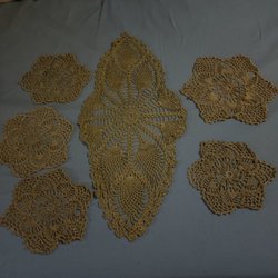 Virkad duk i beige färg. Duken har ett mönster med runda former och små hål.