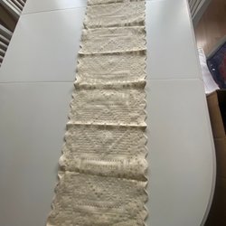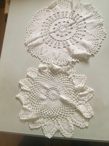 Två vita virkade dukar med detaljerade mönster. En rund duk och en stjärnformad duk.