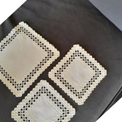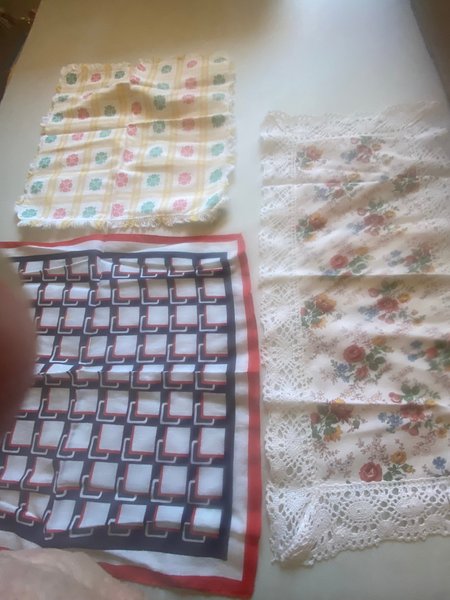Ett set med tre dukar. En duk har ett gult och vitt rutmönster med rosa och turkosa blommor. En annan duk har ett mönster av vita, svarta och röda rutor. Den tredje duken är vit med blommönster i olika färger och har en virkad kant.