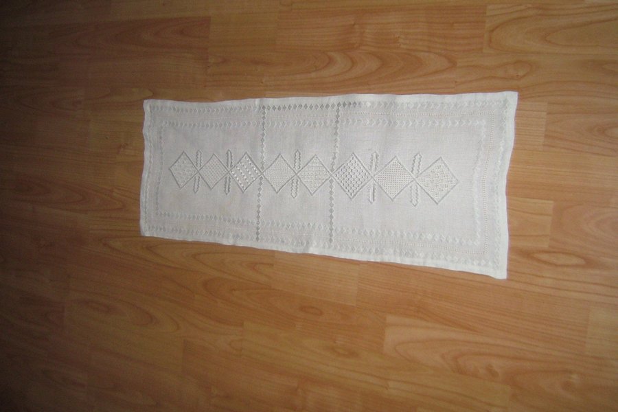 En handbroderad vit duk med detaljerade mönster. Duken har ett rektangulärt format och är prydd med intrikata broderier i form av romber och geometriska figurer längs mitten. Broderad i pärlgarn