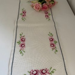 Broderad löpare på klosterväv i ljusgrått med mönster i lila färg. Den mäter 80x35 cm.