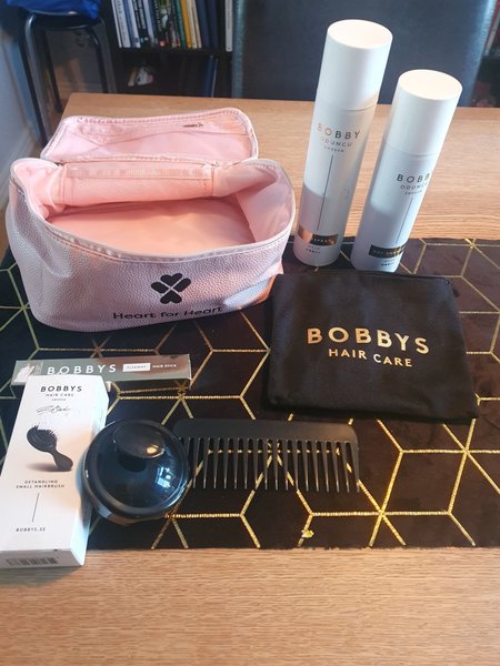 Innehåller Bobby's necessär, hårspray, torrshampo, hårborste, flyaway hair stick, kam och en svart Bobby's Hair Care väska.