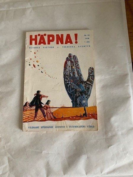 något nött rygg. Tidningen "HÄPNA!" från oktober 1958, nummer 10. Denna utgåva innehåller "VÅLDSAMT SPÄNNANDE ÄVENTYR I VETENSKAPENS VÄRLD".