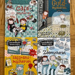 Fyra böcker från LasseMajas Detektivbyrå serien av Martin Widmark och Helena Willis. Inkluderar Cykelmysteriet, Stotts Mysteriet, Detektiv-mysteriet och Biografmysteriet.