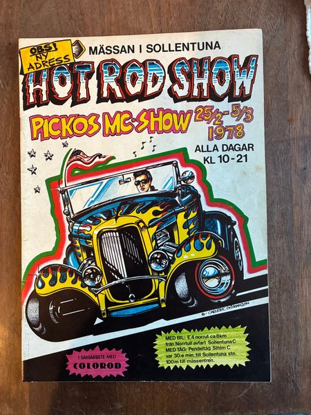 Tidningen "Hot Rod Show Pickos MC-Show" från 1978. Evenemanget ägde rum i Sollentuna mellan 25/2 och 5/3, alla dagar kl 10-21. I samarbete med Colorod. Vägbeskrivning för bil och tåg finns angiven.
