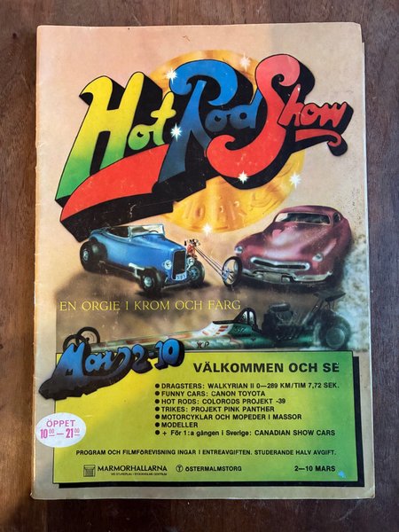 Affisch för Hot Rod Show som ägde rum 2-10 mars. Evenemanget presenterade dragsters, funny cars, hot rods, trikes, motorcyklar, mopeder och modeller. Det inkluderade även Canadian Show Cars för första gången i Sverige. Program och filmförevisning ingick i entréavgiften. Studerande fick halv avgift. Öppetider var 10:00-21:00. Platsen var Marmorhallarna vid Stureplan i Stockholms centrum, Östermalmstorg.