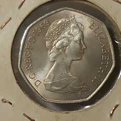 Ett brittiskt mynt präglat 1981 med värdet 50 New Pence. Myntet har ett porträtt av Elizabeth II på ena sidan och en bild av Britannia på den andra.