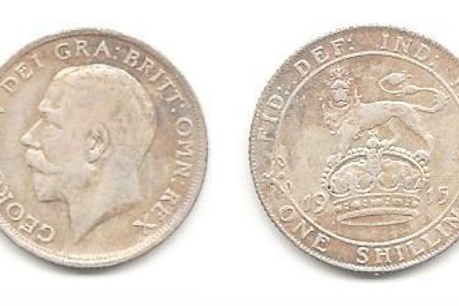 Detta är en brittisk Shilling från 1915. Framsidan visar kung Georg V och baksidan visar ett krönt lejon som står på en krona. Texten "ONE SHILLING" finns tydligt präglad.