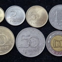 En samling ungerska Forint från olika år och valörer. Inkluderar valörer som 1, 2, 5, 10, 20, 50, 100 och 200 Forint. Årtal sträcker sig ungefär från 1990 till 2000-talet.