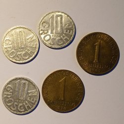Tre österrikiska Schilling. Två 10 Schilling från 1974 och 1985, samt en 5 Schilling från 1987.