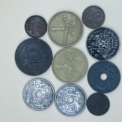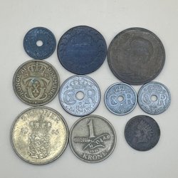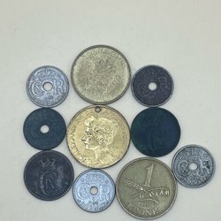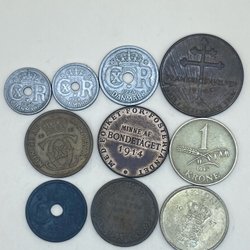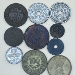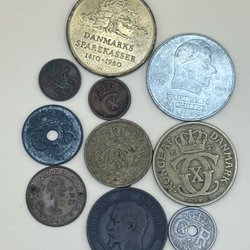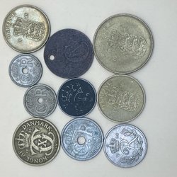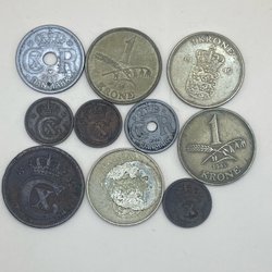 En samling af danske mønter med forskellige årgange og værdier. Inkluderer mønter fra forskellige perioder. Blandt andet 1 krone fra 1948, 2 kroner fra 1958, 1 krone fra 1955, 1 krone fra 1956, 1 krone fra 1950, 1 krone fra 1951, 1 øre.