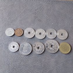 Samling Danska mynt i olika valörer.