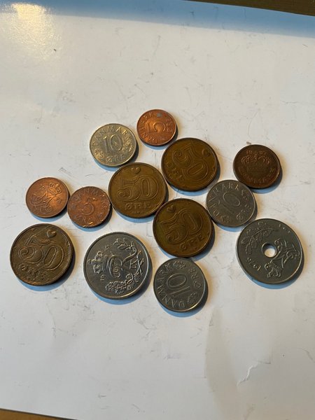 Parti med danska mynt. Innehåller bland annat 10 öre från 1976, 50 öre, 10 öre och 5 öre.