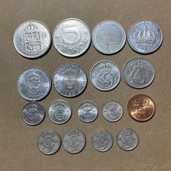 Samling av danska kronor. Inkluderar årtal som 1973, 1979, 1980, 1987 och 1988. Värden inkluderar 10 Kroner och 1 Krone.