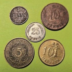 Sex finska mynt. Tre 5 Markkaa mynt från 1972, 1984 och 1983. Två 1 Markka mynt från 1993 och 1996. Ett 10 Markkaa mynt från 1998.