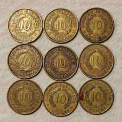 Sex finska mynt. Tre 5 Markkaa mynt från 1972, 1984 och 1983. Två 1 Markka mynt från 1993 och 1996. Ett 10 Markkaa mynt från 1998.