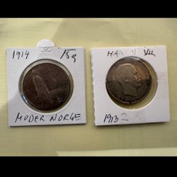 Norska mynt. 1 öre från 1925. 2 öre från 1929. 5 öre från 1940, 1941 och en grå 5 öring från 1942. Kan ingenting om mynt så jag kan inte säga vilket skick dom är i.