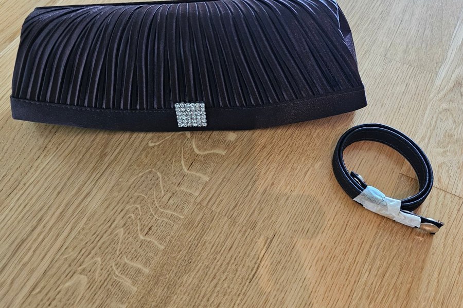 Elegant mörkbrun aftonväska med plissering och en dekorativ fyrkantig detalj med strasstenar. En smal axelrem medföljer. Använd 1 gång, som ny.